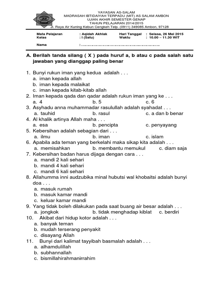 Baiklah berikut ini contoh soal latihan pas mata pelajaran akidah akhlak kelas viii 11. Aqidah ahlak kelas 10 jawablah pertanyaan berikut dengan benar ! Soal pts/uts ma kelas 11 semester 2. Soal ini merupakan hasil dari musyawarah guru mata pelajaran. Ulangan tengah semester genap madrasah ibtidaiyah. Sifat wajib allah swt wujud sedangkan sifat mustahilnya dari wujud yaitu… a. Soal uts akidah akhlak kelas 4 semester genap. Soal uts semester genap ma kelas xi mapel akidah akhlak download . Pos sebelumnya download soal akidah akhlak sd/mi kelas 4 semester 1 dan kunci jawaban. Referensi semester ganjil ujian akhir semester atau penilaian akhir semester (uas/pas) untuk tahun pelajaran ini. Beranda › akidah akhlaq › bank soal › kelas 4 › kunci jawaban › mi › sd › semester 1 › uas i. Para sahabat gurujugan, pada postingan kali ini akan berbagi beberapa soal yang mungkin akan dibutuhkan para guru untuk bahan referensi membut soal penilaian akhir semester. Biasanya akan diadakan di bulan mei atau juni.